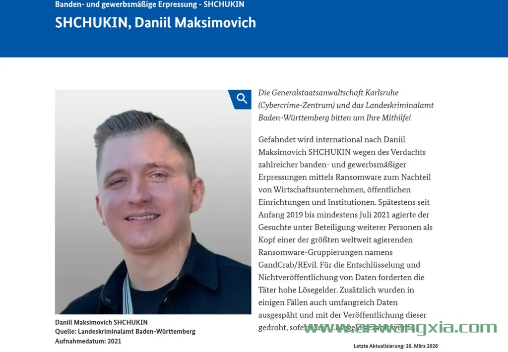 在网络安全界,“UNKN”(也称Unknown)曾是一个令人闻风丧胆的代号。他是俄罗斯勒索软件生态系统中最具影响力的核心人物之一。然而,根据BKA官方通缉页面披露的细节,这位曾不可一世的黑客真名叫作Daniil Maksimovich Shchukin(丹尼尔·马克西莫维奇·舒金),现年31岁。