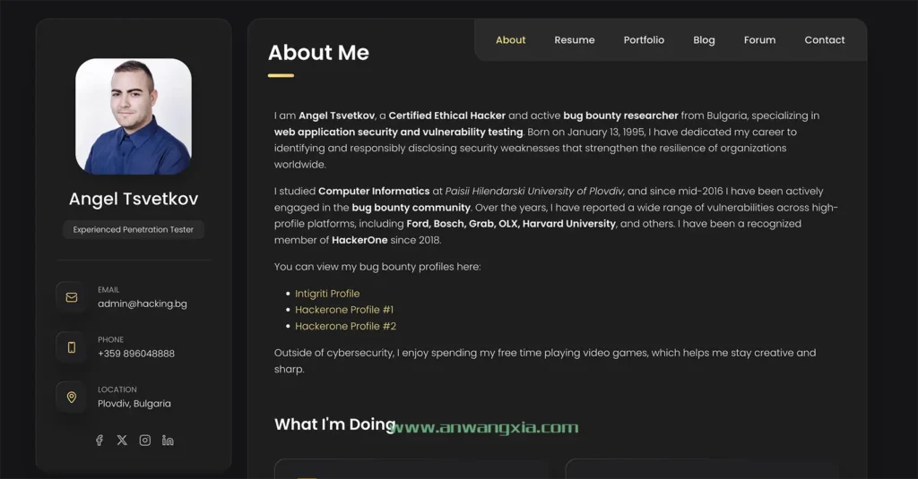PwnForums已确认N/A为安吉尔·茨韦特科夫 (Angel Tsvetkov),他是一名保加利亚网络安全专家、渗透测试员和漏洞赏金研究员,拥有渗透测试和漏洞研究背景。他以其在识别和负责任地披露全球主要平台漏洞方面的工作而闻名。他在HackerOne和Intigriti等平台上享有盛誉,曾报告过影响大型企业的漏洞。他的工作主要集中在Web应用程序安全、漏洞发现和对抗性测试方面。