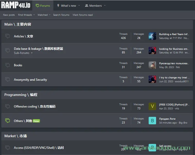 RAMP基于商业论坛软件XenForo 2.2.5搭建,设有出售网络访问权限、恶意软件、勒索软件合作、被盗数据,以及招聘犯罪自由职业者的专门版块。主版块与子版块的版块名称包含俄语、英语、中文,帖子标题也混杂俄语、英语和中文,显示出它的国际化程度。